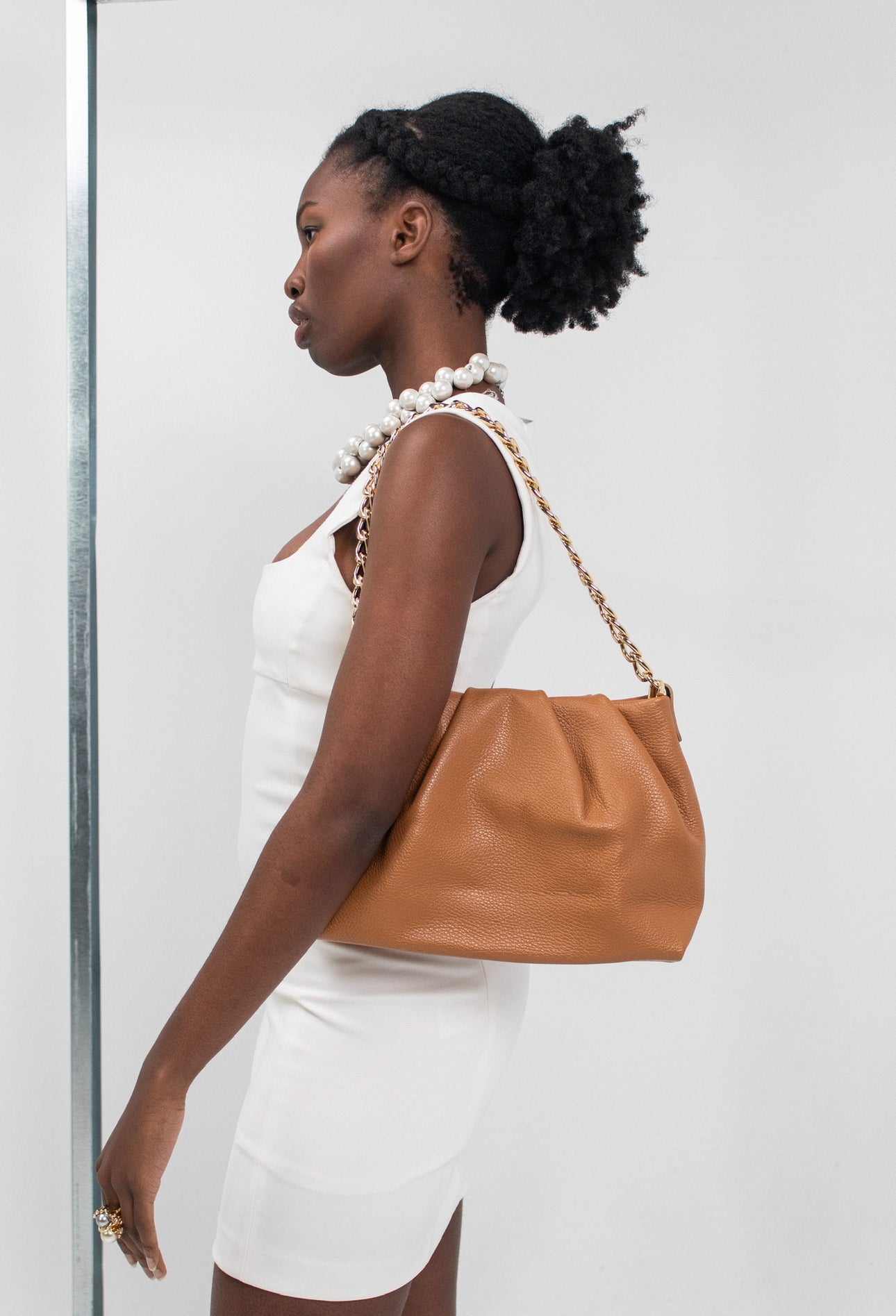 "Descubre la sofisticación y versatilidad del bolso tipo Pouch de piel de vacuno de grano. Con un elegante cierre de cremallera y una cadena dorada que agrega un toque distintivo, este bolso es el complemento perfecto para cualquier ocasión.